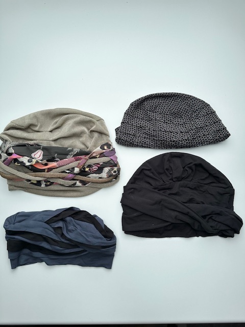 4 stk. kemohuer alle fra brandet House of Christine, De er alle fra kategorien turbans, en helt sort, en lys med løst ’pyntebånd’, en blå med sort og den sidste er mørkeblå med lyst mønster. 3 turbans er kun brugt ganske få gange, hvor den sidste – den mørkeblå med lyst mønster er god men brugt.