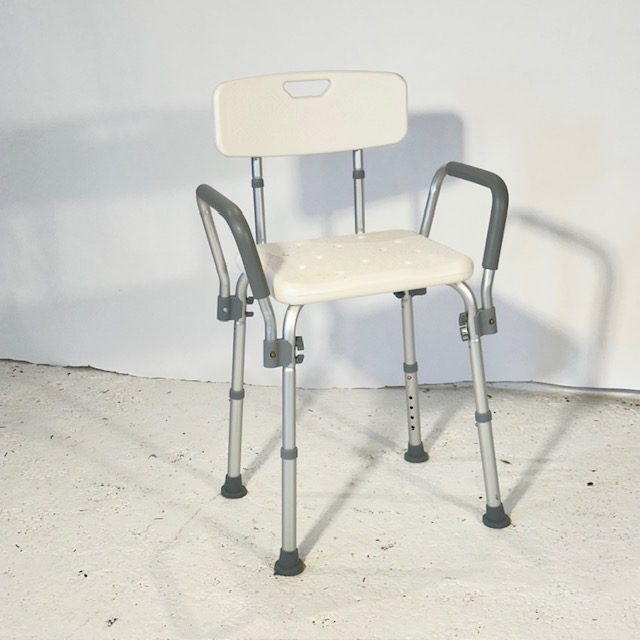En fin næsten ny badestol med ryglæn og armlæn. Sædet er med drænhuller, og den kan indstilles i 6 forskellige højder fra 43-55 cm. Den har en fin størrelse til at passe ind i en bruseniche og med de store skridsikre fødder, står den stabilt under brug.