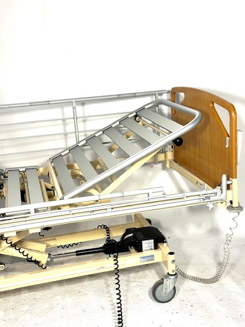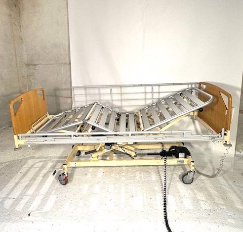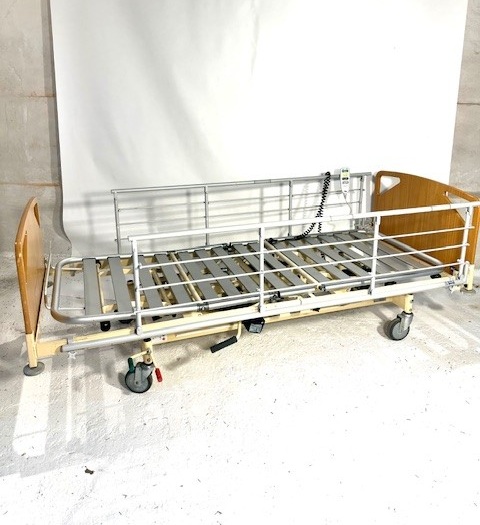 Denne plejeseng med sengeheste har elektrisk betjente funktioner, dog skal fodenden hæves manuelt. Liggefladen har aluminiumlameller og sengehestene er aftagelige.