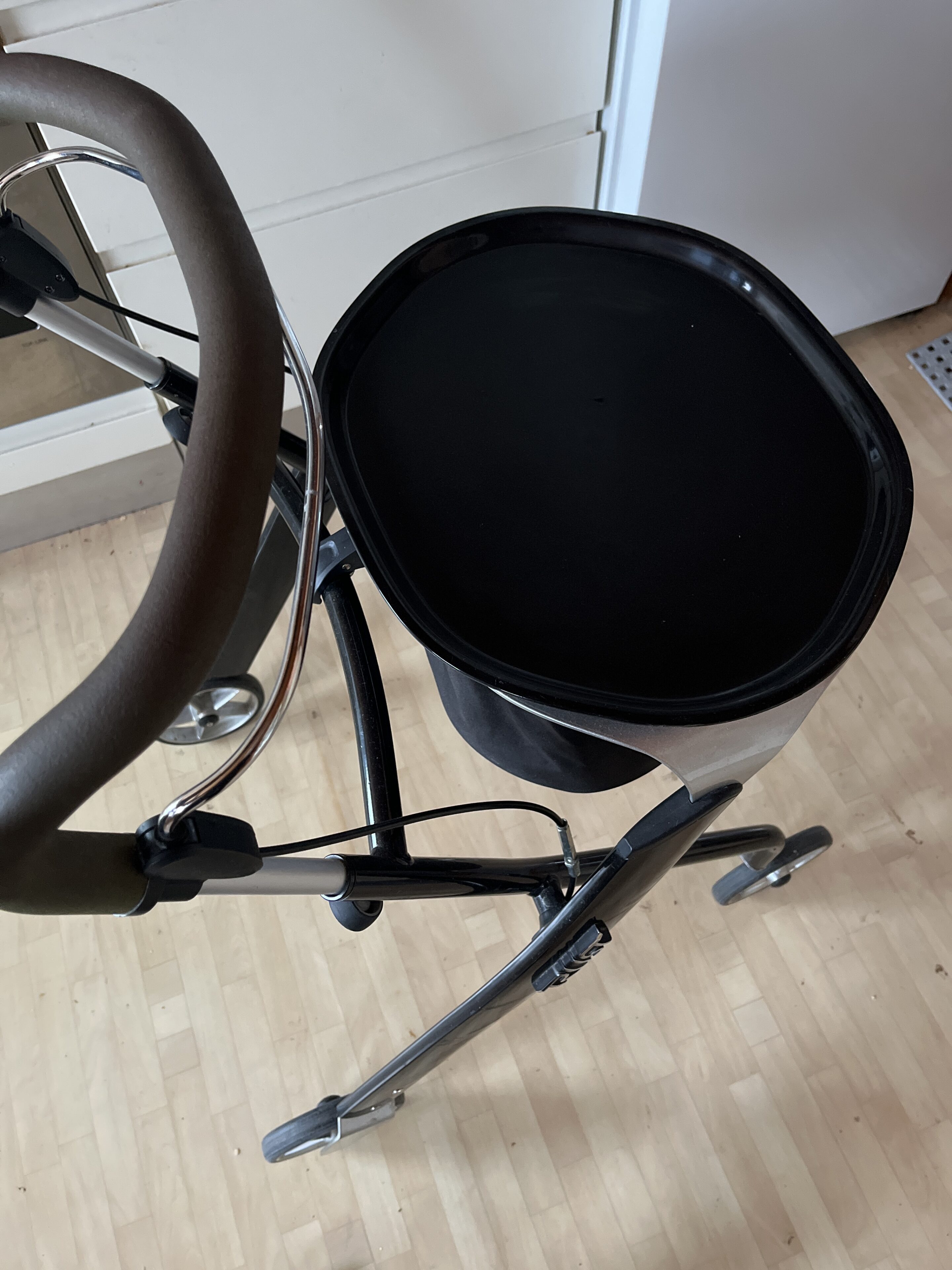 TrustCare Let’s dream indendørs rollator , brugt meget sparsomt og er ellers blevet opbevaret i bryggerset . Ingen ridser , inden tegn på slid , ingen brugsspor . Der følger opbevaringstaske og bakkebord med .